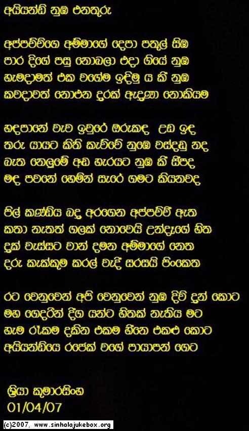 You are hereby invited to submit "Geetha Katha" for possible publication in this page. We reserve the rights to choose what will be presented, yet submitter is responsible for the content and not the page maintainers. We welcome all forms of creative work including but not limited to short stories, jokes, poems, and satire either in Sinhala and/or English.