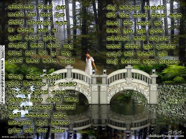 You are hereby invited to submit "Geetha Katha" for possible publication in this page. We reserve the rights to choose what will be presented, yet submitter is responsible for the content and not the page maintainers. We welcome all forms of creative work including but not limited to short stories, jokes, poems, and satire either in Sinhala and/or English.