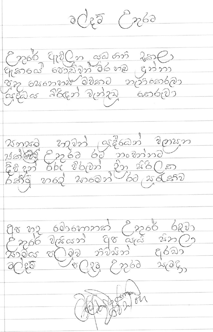 You are hereby invited to submit "Geetha Katha" for possible publication in this page. We reserve the rights to choose what will be presented, yet submitter is responsible for the content and not the page maintainers. We welcome all forms of creative work including but not limited to short stories, jokes, poems, and satire either in Sinhala and/or English.