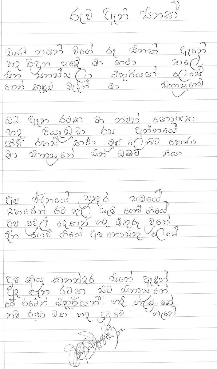 You are hereby invited to submit "Geetha Katha" for possible publication in this page. We reserve the rights to choose what will be presented, yet submitter is responsible for the content and not the page maintainers. We welcome all forms of creative work including but not limited to short stories, jokes, poems, and satire either in Sinhala and/or English.